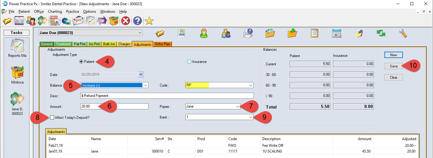 A Refund Payment is used when a patient or insurance company has made an over-payment on his/her account and it has been applied to a treatment or claim. You can refund a payment from Adjustments tab. This will NOT affect deposit if you are writing a cheque to the patient or insurance company. (If you are giving them cash or refunding their debit or credit card it could affect deposit)