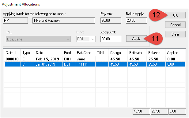 - Highlight the treatment line you want to attach the refund to. (Not the summary line for that visit) and fill in the “Apply Amt” box.