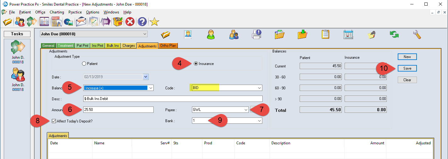 The Bulk Insurance Debit adjustment is only used when you get a negative amount on a bulk insurance cheque. (ie. the insurance company is taking money back). This adjustment WILL affect your deposit if your bulk cheque was entered today. This adjustment reverses a portion of a bulk, or a full bulk insurance payment that has been applied to a patient.
