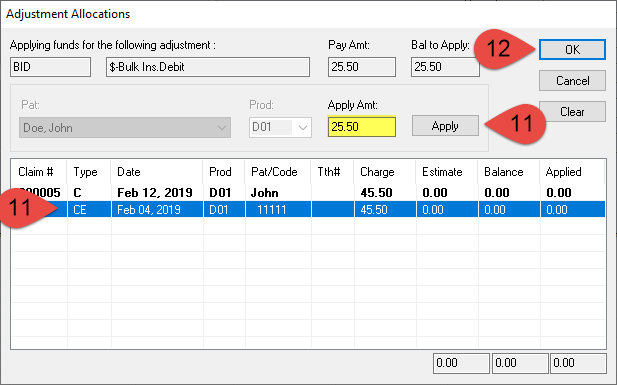 - Highlight the treatment line that you want to apply all or part of the adjustment to, type in the amount to be applied to that line in the Apply Amount Click Apply.