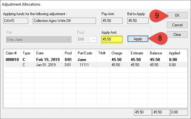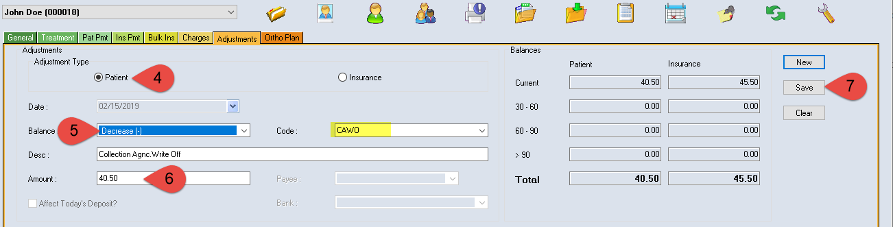 A Collection Agency Write Off is used when an account is not collectible, and you want to send it to collections. This adjustment WILL decrease the balance on the account and WILL affect your accounts receivable total but WILL NOT affect the deposit.