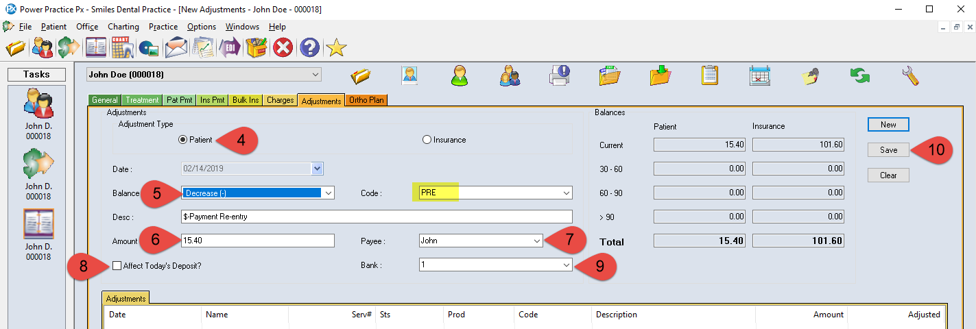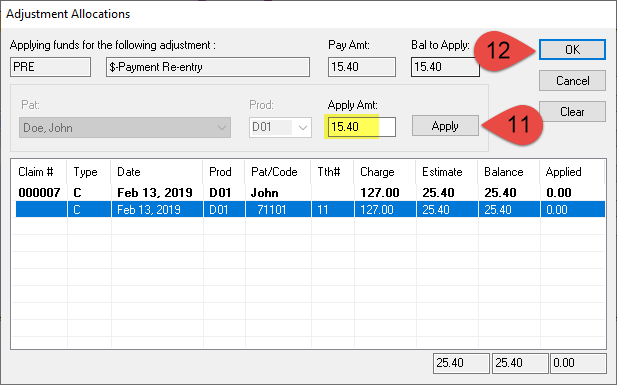 A Payment Re-Entry is done when a payment that has been received and deposited was not posted into the ledger. It needs to be recorded but not affect your deposit This adjustment WILL affect the accounts receivable total but WILL NOT affect deposit.