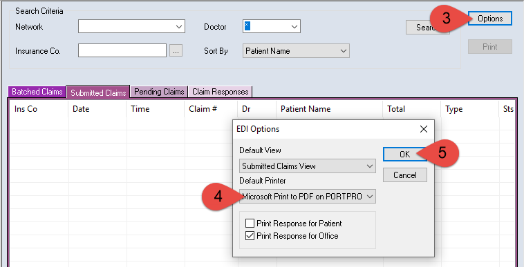 Description This article will guide you through specifying what printer EDI claim responses will print to by default. Step-by-Step Select Office from the top menu bar. Then select EDI Manager from the sub-menu. Select the Options button in the top right corner. In the Default Printer drown down, select the printer from the list that you want to become the default. Select the OK button to save the change. Additional Resources