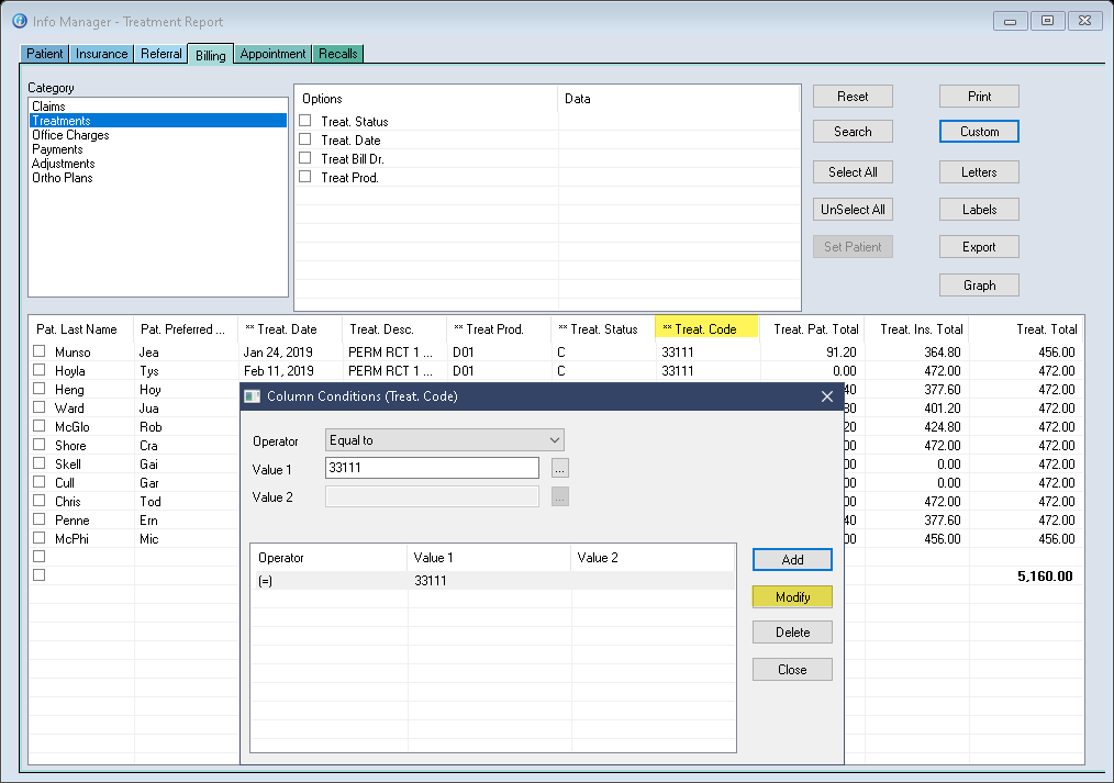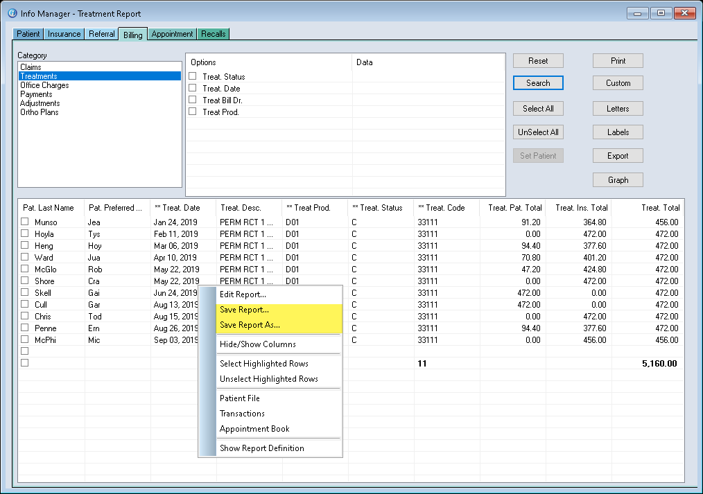 The first key point regarding saving reports is that the Info Manager will save reports under the specific Tab and Category they were created. This means a report created in the Billing tab, under the Treatments category, will only be accessible under those very same directories. If you cannot find a saved report, chances are you’re looking under the wrong tab and/or category.