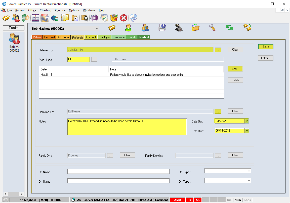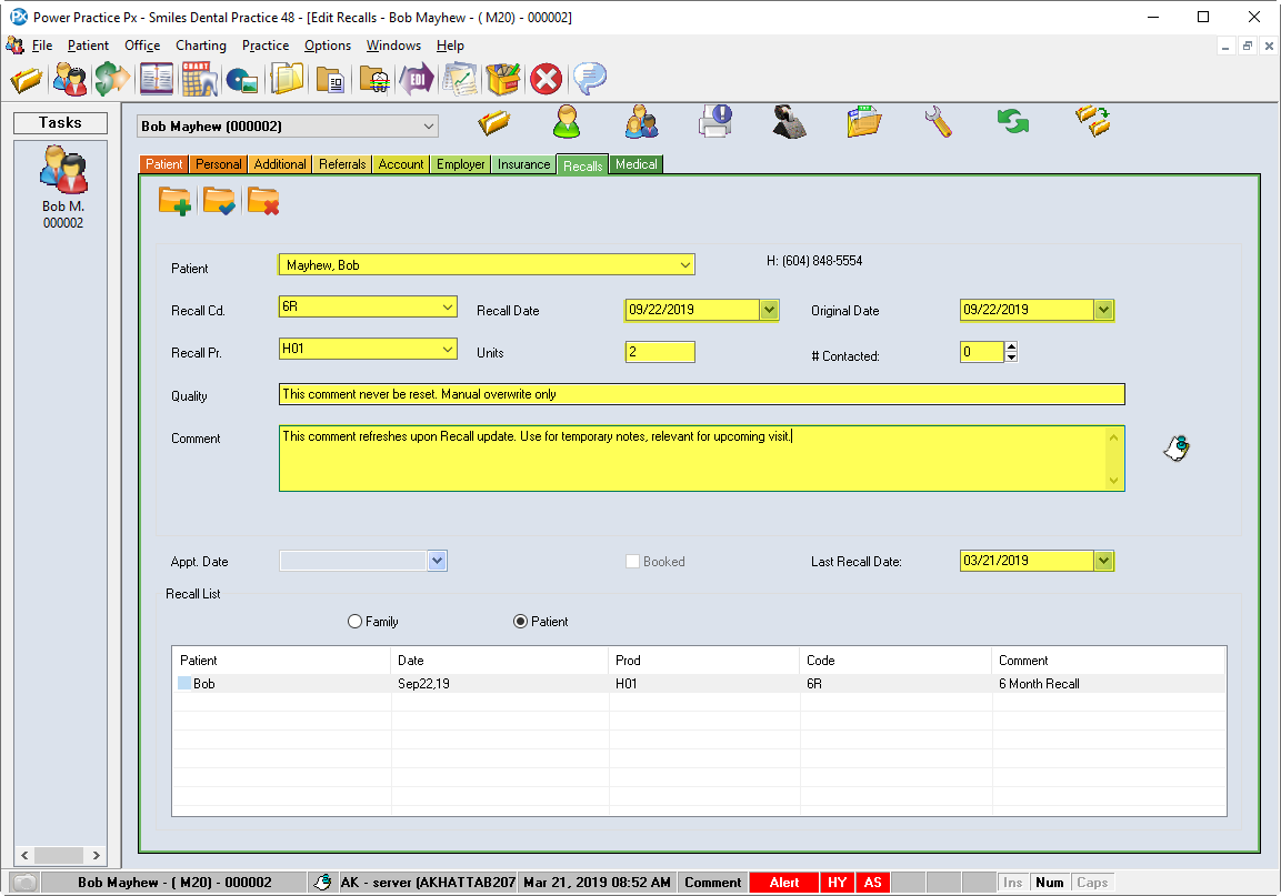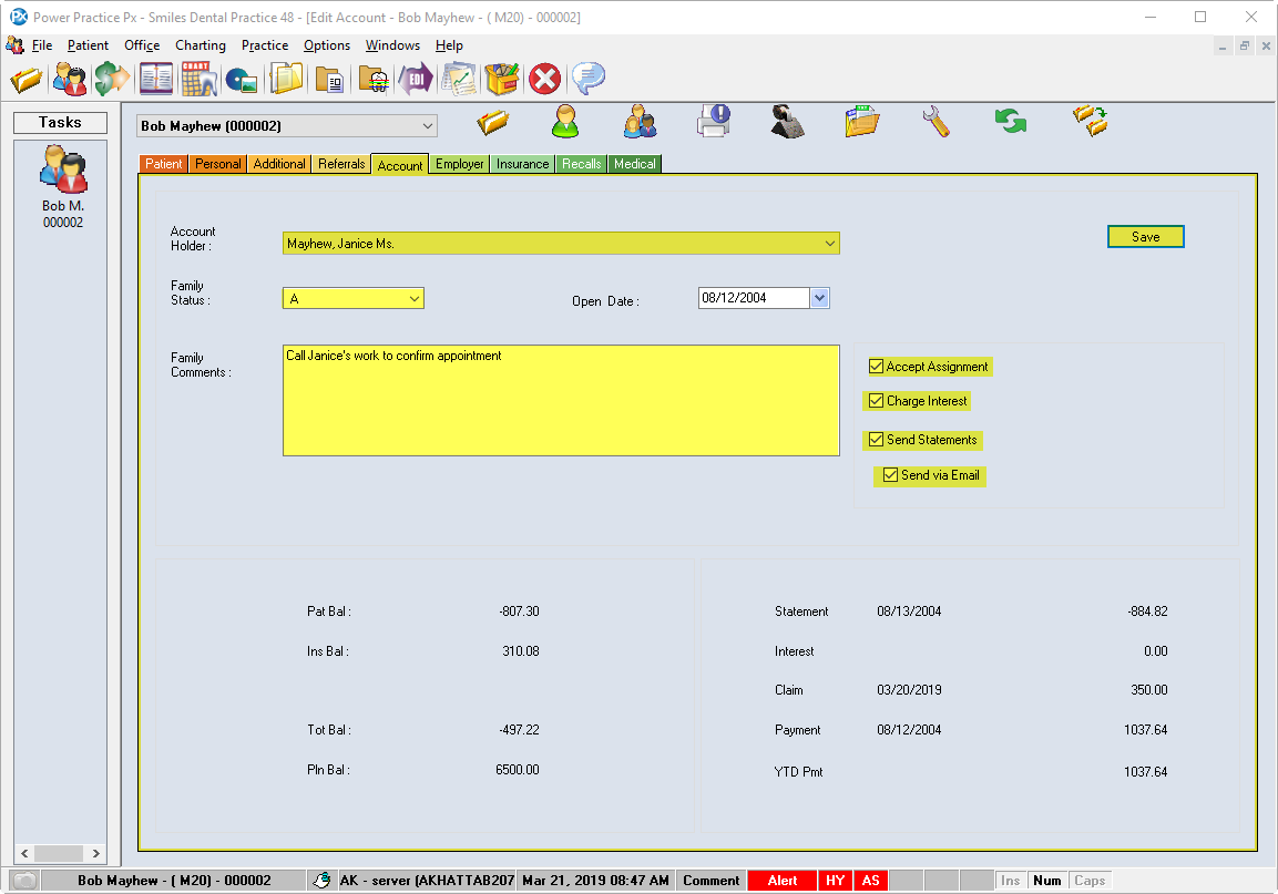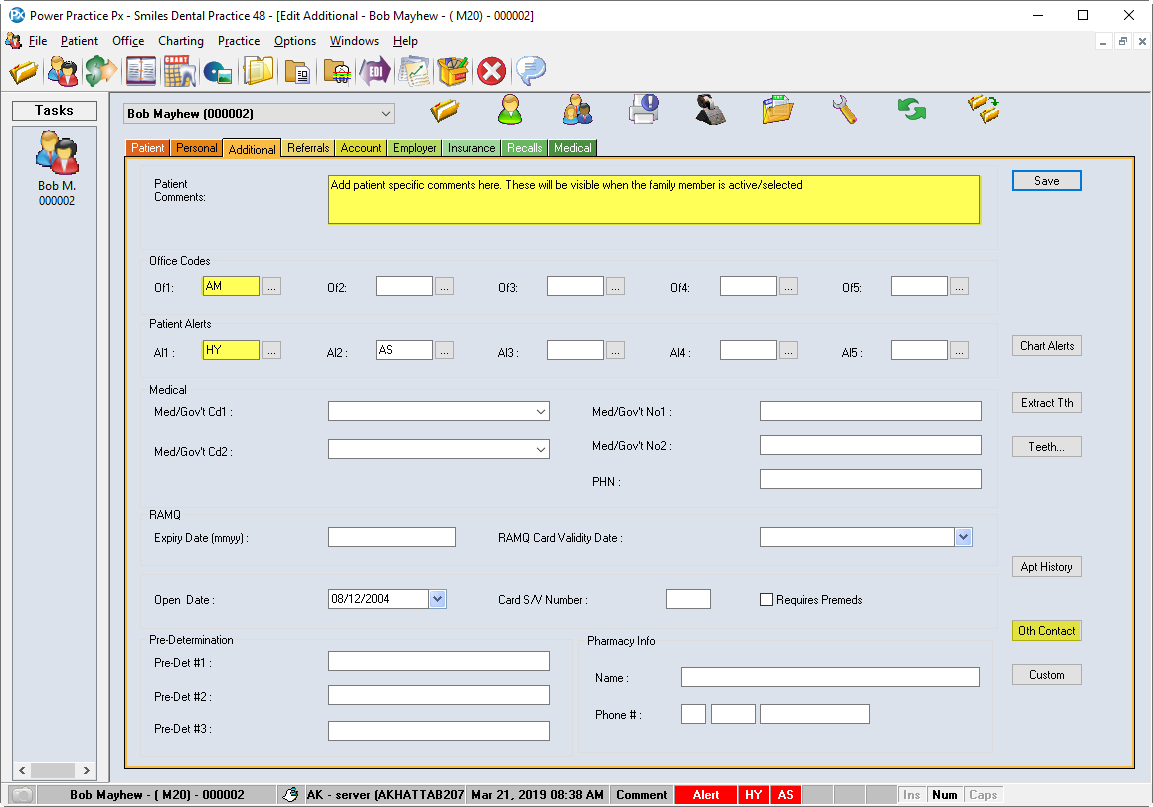 Additional Information specific to the individual patient can be seen, added, or edited on each of the tabs to the right of the Personal Screen. Once saved, a general overview is available from the Patient Tab. Much of the information also carries into other tasks such as Transactions or the Appointment Scheduler.