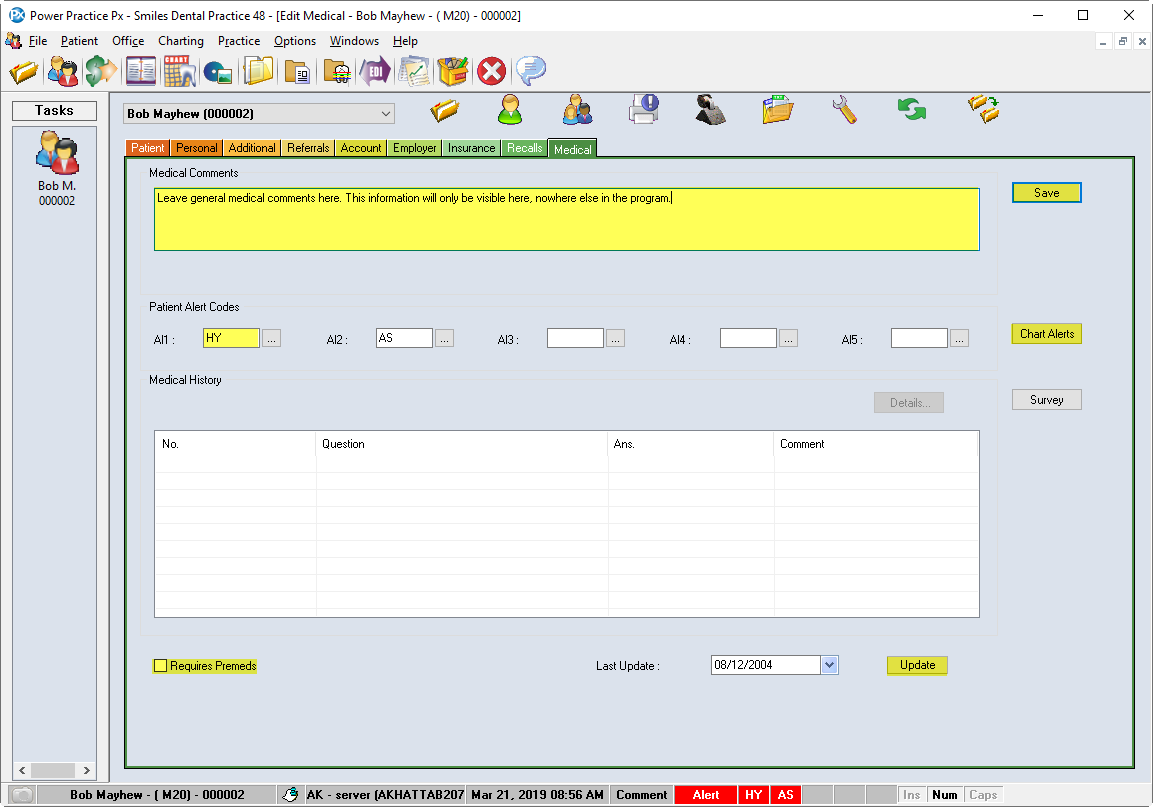 - Patient Alerts: Medical alerts can be entered here, but the Medical tab is more ideal for this task. Click on the “…” (ellipses) button to see the available codes. These alerts show with the patient’s information in red.