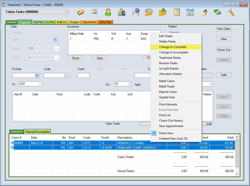 - Right click the highlighted line(s) to access the menu and select Change to Complete