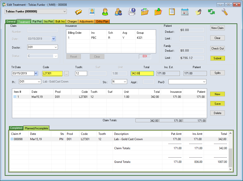 When a treatment has been entered as Planned, there is a process required to change the Planned Status to Completed once the work is performed. When there is a lab involved, the office has an option to use the Incomplete status to post the Doctor’s fee on the preparation day which creates a Revenue line for that day.