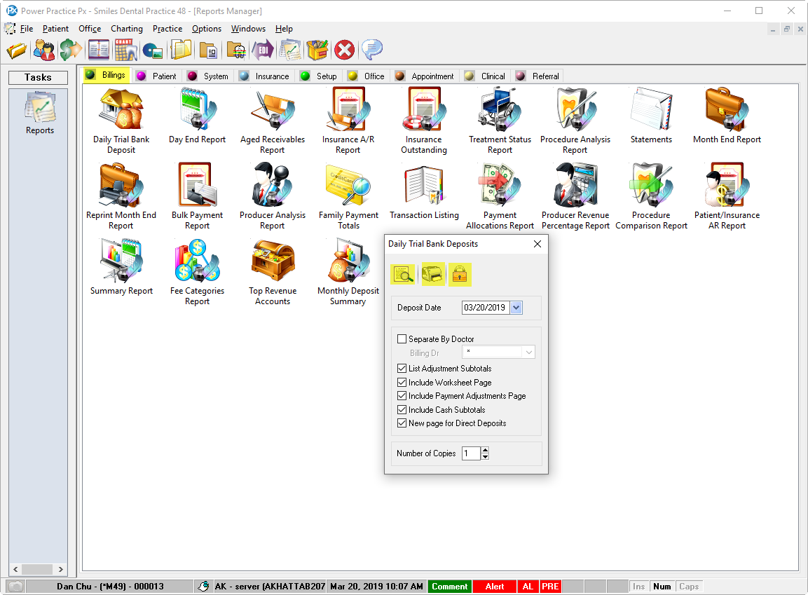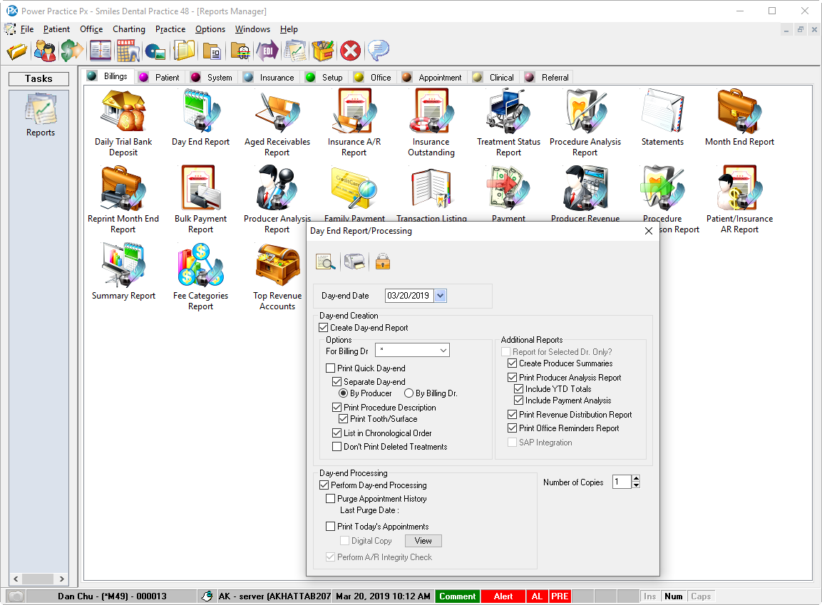 It is recommended you run some reports at the end of the day to check your work. These reports are located in the Reports Manager module, found under the Office menu item. These reports have many options and can be set to default to specific settings.