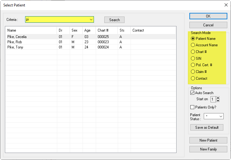 Once the Open Pat folder window is active, we can use one of the many search methods available. By default, Power Practice will use the Patient Name (Surname, First Name). Contact mode allows you to use a phone number or Email on file.