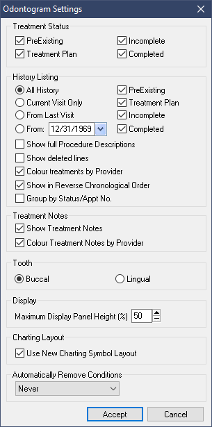 History Listing: Specifies which treatment status and date range to display in the Odontogram’s Descriptive display (treatment history box).