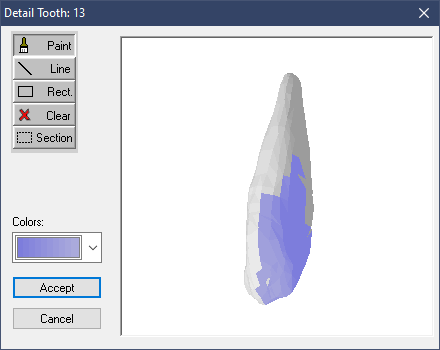 The Paint Tooth icon allows detailed drawing on a selected anatomical tooth. This feature may be used to draw a more accurate picture of an existing or a completed filling.