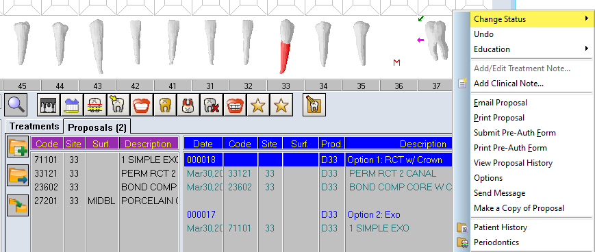 The statuses of proposals can be changed to accurately reflect the patient’s decisions. These statuses can be managed by clinical staff or reception. There are four statuses: New, In Review, Declined and Accepted. Proposals that are New or In Review will show in the proposal section. Proposals that have been Accepted or Declined are technically no longer “proposals” and will therefore not appear in the Proposal section of the Odontogram. They can be viewed in the Proposal History, an option in the right click menu.