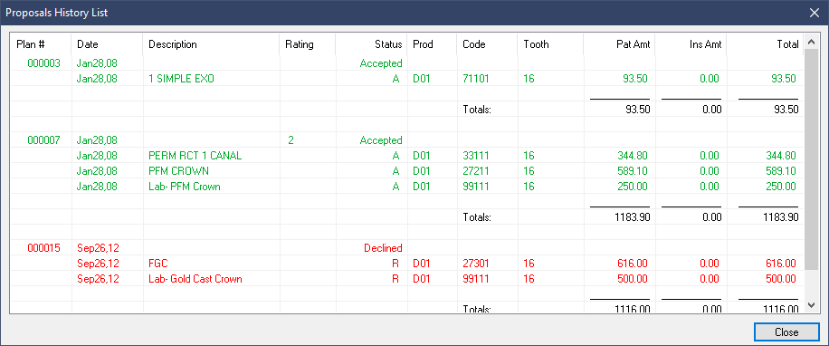 - Accepted – The proposal will change into a Planned Treatment, and is moved into the Treatments tab. A copy of the accepted proposal shows under the Proposal History in green.