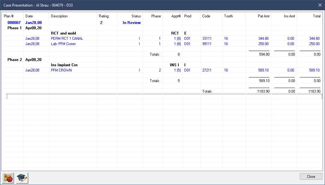 As of version 4.9, proposals with no status and those In Review can be broken down into more detailed Phases. This helps reorganize the collective bulk of treatments within a proposal into organized sub-divisions, helping both the clinician and patient to get a clearer picture of just what a given course of treatment entails. The phase breakdown window is accessible through the double folder icon