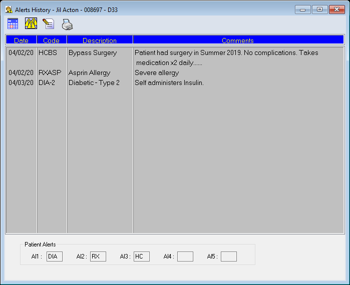 E.g. We can set the Alert 1 box to read “HC“, standing for Heart Condition. We can then use Chart Alerts to expand on that, selecting something like HCBS to represent “Heart Condition – Bypass Surgery”.